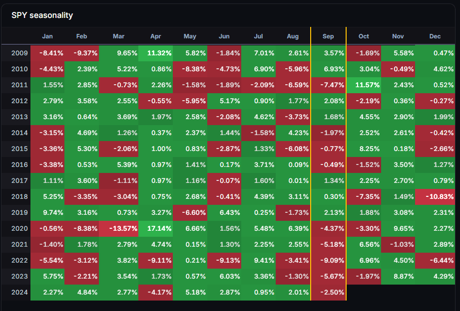 下圖係$MSFT和$SPY係過去16年每月的表現,分別有1/2機會和9/16機會走弱,但十月升返既機會好高,值得留意